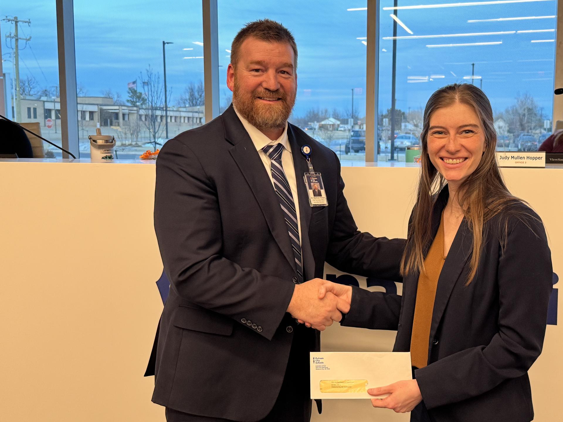 Staff Reports Cancer Fund Drive & Donation to OMRF – Dr. Matthew Flinton, Chief Secondary Officer, and Joy Murphy, Executive Director of the Putnam City Foundation Recognition of Site Teachers of the Year – Michelle Hopper – PCACT Teacher of the Year Chair